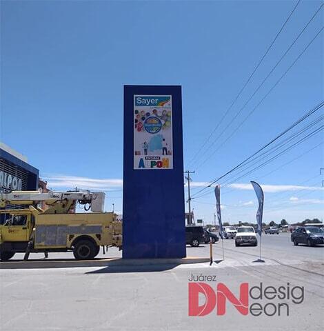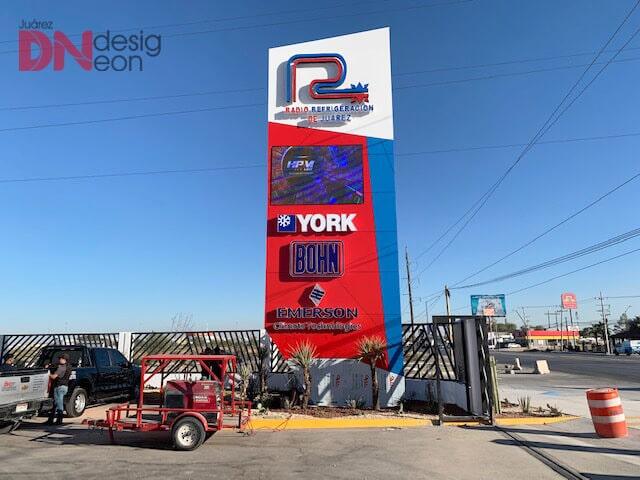 Radio Refrigeraciones de Juárez: Anuncio luminoso tipo tótem de nuestro cliente RADIO REFRIGERACIONES DE JUÁREZ con letras individuales por ambas caras, así como pantallas digitales. Instalado en la Blvd. Gómez Morín.